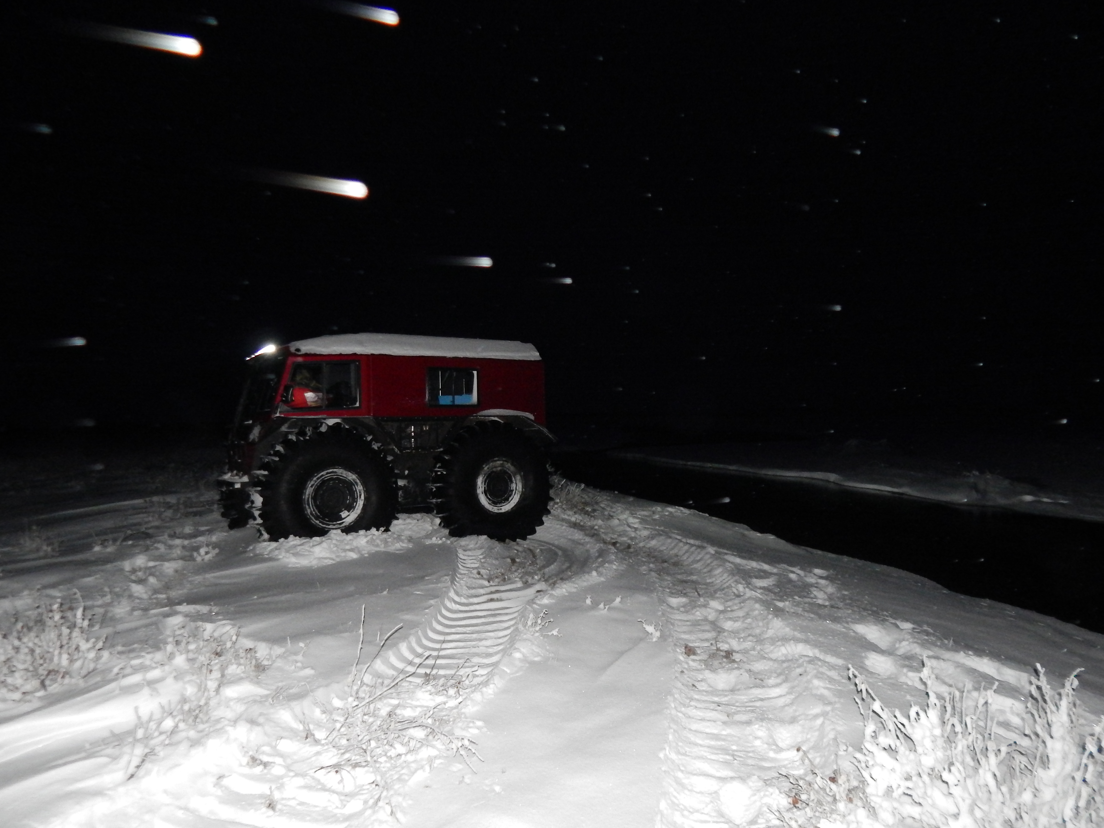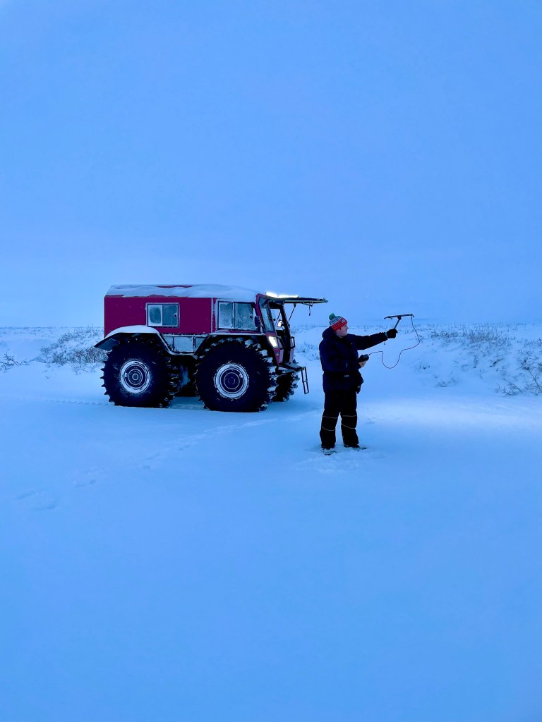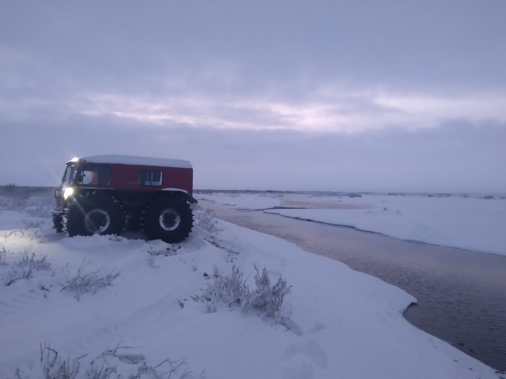 To visit the site on the Shaviovik River approximately 20 miles away, Sue piloted us across the frozen, snowy tundra in her Sherp, a vehicle with very low tire pressure designed to avoid damage to the landscape.
