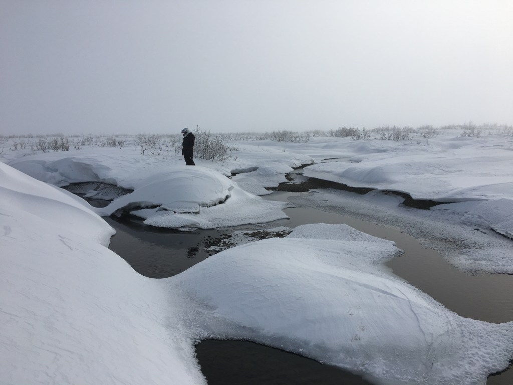 At the site of the fish die-off, open water prevailed, despite adjacent sections of river being frozen. Groundwater upwellings in this area produce warmer water that allows for open water later into the winter, which provides pockets of fish overwintering habitat (river ice doesn’t freeze to the gravel bed). Published scientific literature asserts that these localized, scattered upwelling spring complexes provide the best, and sometimes the only, overwintering habitat for fish in most rivers on Alaska’s North Slope.