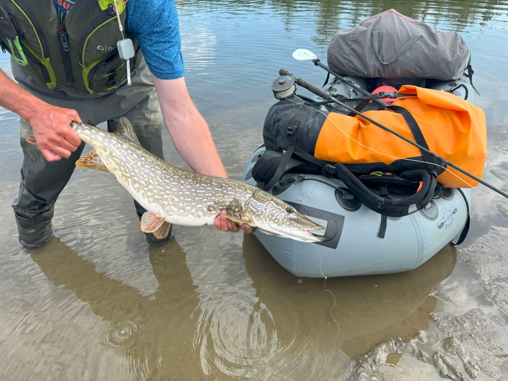 Finally, we floated 40 miles of the lower Alatna River, downstream of where the Ambler Road might cross. Because of challenges with floatplane logistics, we hired an elder from the Koyukon village of Allakaket to transport us upstream in his motorized boat. After being dropped off, we floated for several days and collected our samples. Grayling and pike were particularly abundant, and we also observed large groups of spawning chum salmon. We were hoping to catch a wider range of species on this trip, but ended up with primarily pike and grayling.