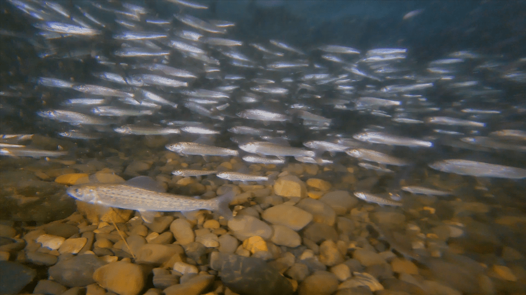 The wintry conditions at the site necessitated using an ice auger, ice saw, and an axe to chop holes for deploying the underwater ROV, retrieving dissolved oxygen loggers, and checking on the status of the overwintering fish. After overcoming some challenges due to the ice conditions, the equipment was retrieved and the fish were observed. Despite being relegated to a very small under-ice pool, the grayling that were observed appeared largely healthy, except for one fish we noticed that had perished.