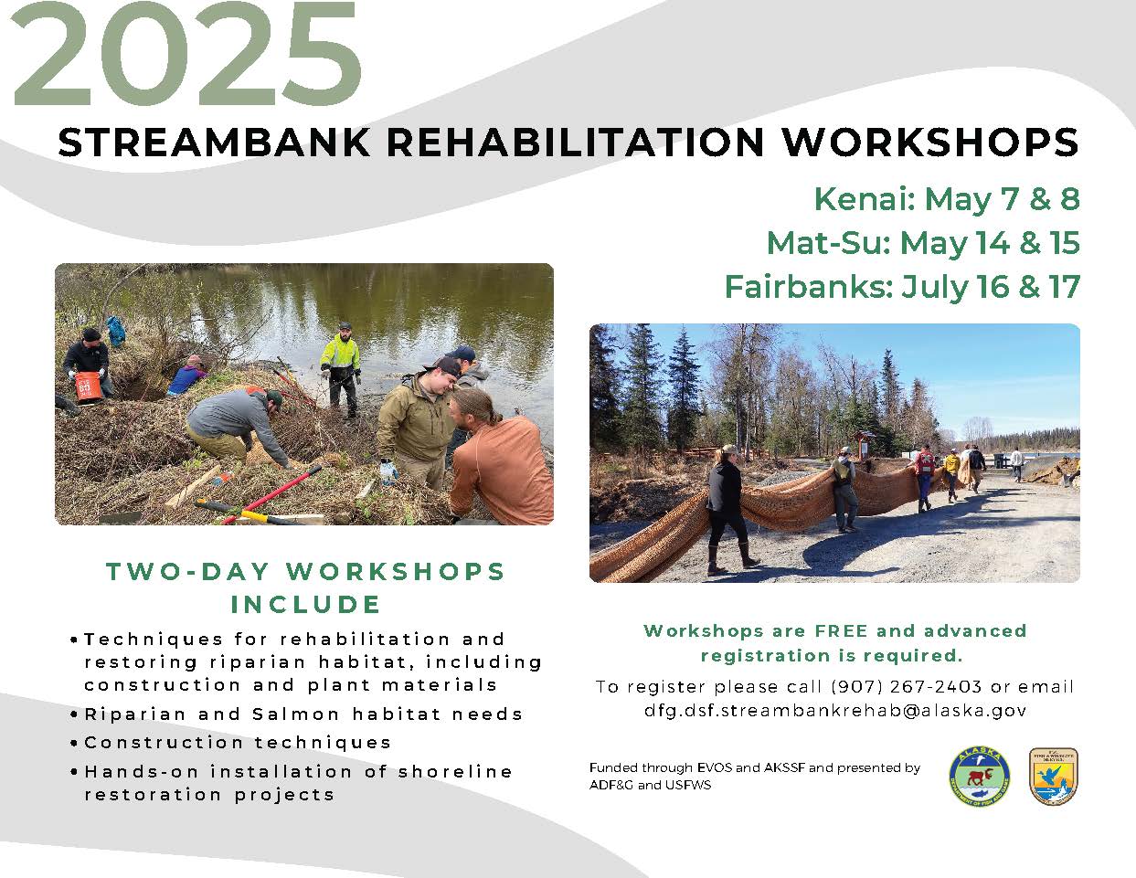Fairbanks Streambank Restoration Workshop: July 16 (classroom) and July 17 (Hands-on), 8:30 am-5:00 pm. Email DFG.DSF.StreambankRehab@alaska.gov to register.