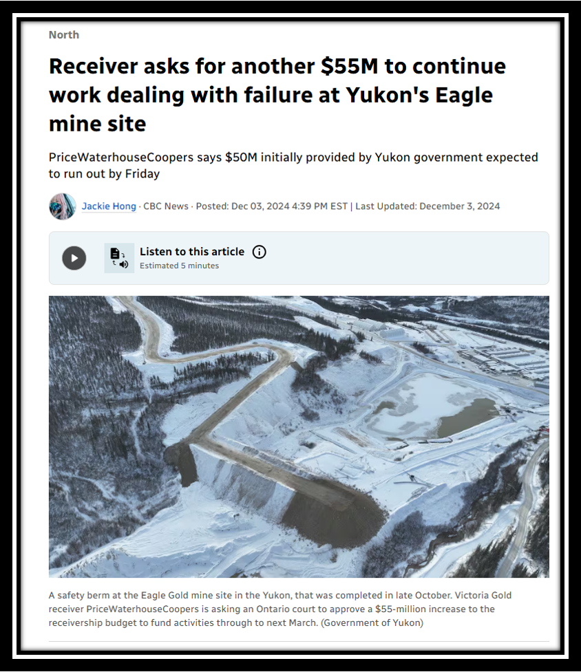 -The mine and Victoria Gold company have been put up for sale as part of the “receivership” (i.e., similar to bankruptcy) proceedings. Gold extraction/mining activity could be allowed to continue under any new owners