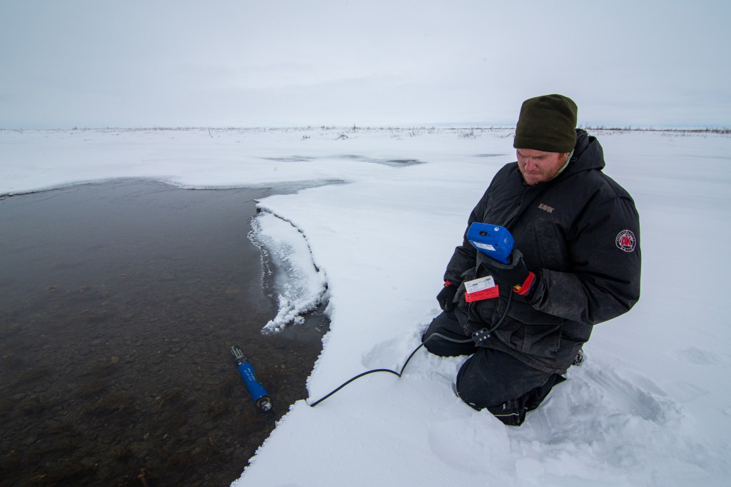 On Alaska’s North Slope, perennial riverine springs play an important role in the distribution and ecology of aquatic biota. For overwintering fish, perennial springs are an important unfrozen habitat crucial for wintertime survival, spawning, and rearing, showing that streams without spring input commonly freeze solid during winter. Springs can harbor an entire river’s fish population for over six months of the year, and these high concentrations of fish may serve as food sources for predators and scavengers including wolverines, foxes, ravens, and American dipper. As such, these scattered, limited perennial spring areas are likely critical for not only fish but also mammals occupying this region during the long, cold, food-poor winter months. Nonetheless, little is known about wintertime habitat conditions at these sites, including possible effects of local ice conditions on fish mortality and subsequent scavenging activity. The need for additional study of North Slope overwintering spring habitats was highlighted by the observation of a mass fish die-off at a perennial spring along the Shaviovik River in April 2022. The fish die-off occurred in a small spring-fed pool that was completely encased in ice during late winter. The lack of an air-water interface likely caused hypoxic conditions that killed more than 150 overwintering Dolly Varden and Arctic grayling, 56 of which were carried onto the surface of the ice during an overflow event and made available to scavengers including wolverines. This die-off was found when a WCS field crew investigated the site following visits by a GPS-collared wolverine.