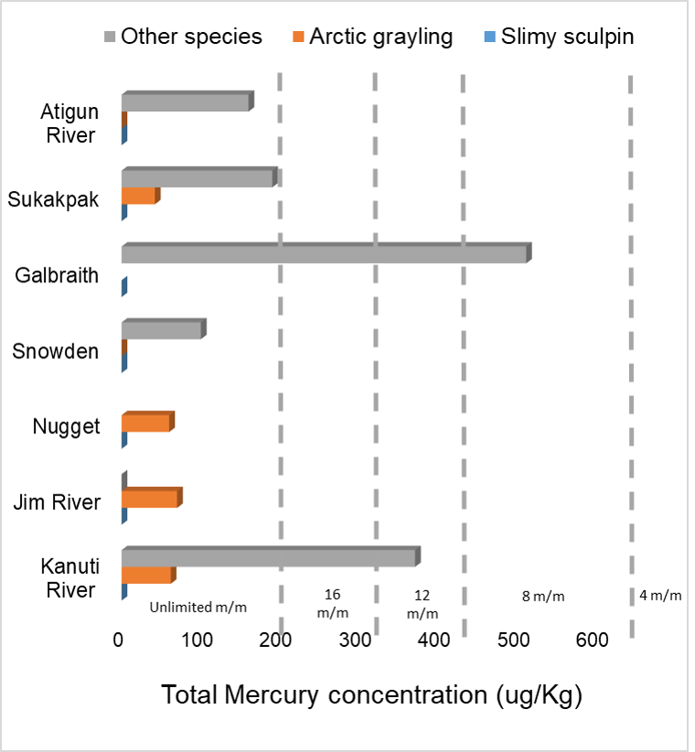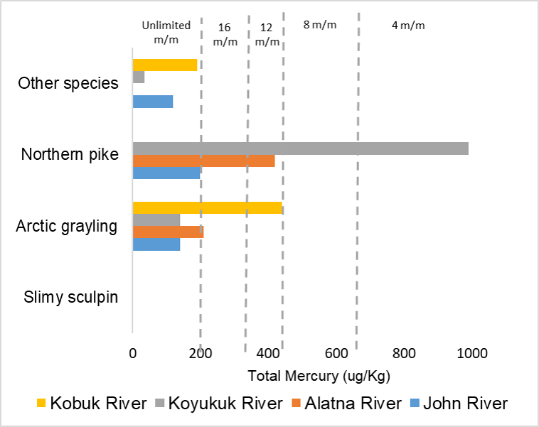 Similar to Dalton Highway sites, most fish sampled were below the State of Alaska levels where consumption of fish begins to have limited meals/month recommendations for women of child bearing age, nursing mothers, and children. However, northern pike collected from the Koyukuk River (two of six fish), John River (one of four fish), and Alatna River (four of ten fish) contained levels that are above “unrestricted” consumption guideline thresholds (i.e., sensitive populations should limit number of meals per month, see below graph). Additionally, a large Arctic grayling in the Kobuk River (one of ten fish) and an Arctic grayling in the Alatna River (one of eleven fish) had levels of mercury high enough to warrant limiting consumption to 12-16 meals per month for people sensitive to effects of the contaminant. Overall, no fish reached the “do not eat” threshold set by the State of Alaska.