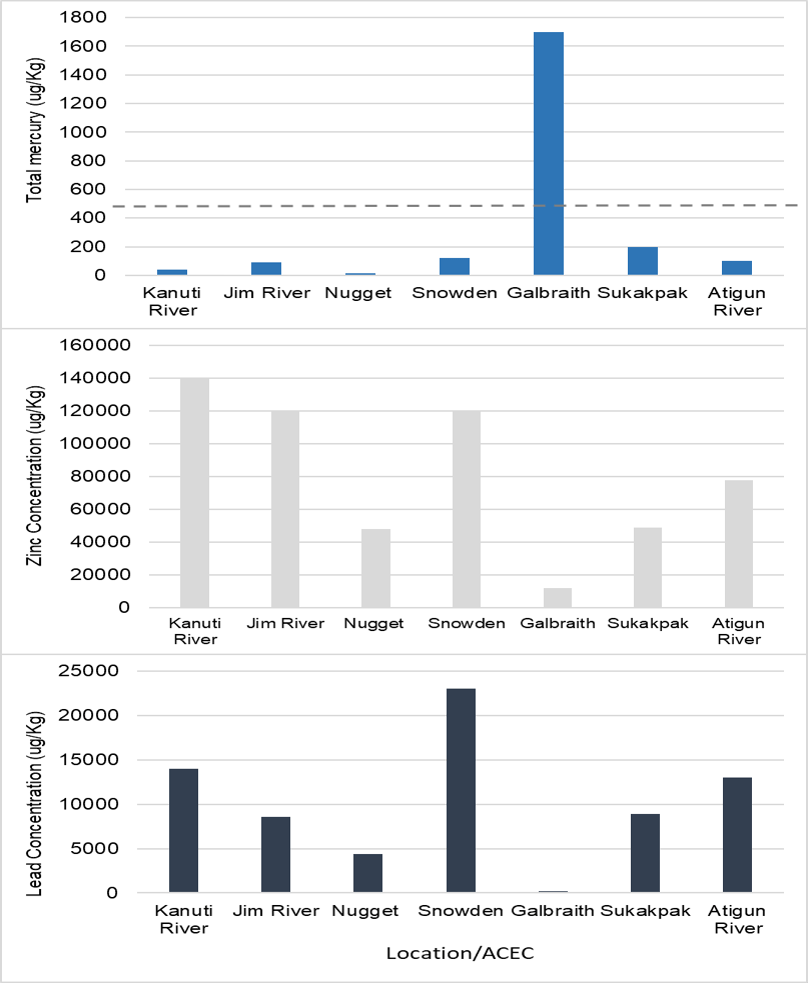Slimy sculpin, fish species harvested for subsistence, aquatic invertebrates, periphyton, and sediment samples were collected for contaminants analysis at waterbodies within or adjacent to existing and historic BLM Areas of Critical Environmental Concern and lands along the Dalton Highway slated for possible land use change under alternatives of the 2020 Central Yukon Draft Resource Management Plan, which included 9 total locations in boreal and Arctic Alaska. Sampling was also conducted at sites along the Alatna, John, Koyukuk, and Kobuk Rivers that would potentially be affected by the proposed Ambler Road. Samples were shipped to a laboratory for mercury, copper, arsenic, zinc, lead, and PFAS analyses. Contaminant results were compared between sampling locations, fish species, and body sizes. Values were compared to results from historical studies, and assessments regarding the contaminant values found and applicable state and national fish consumption guidelines were conducted.