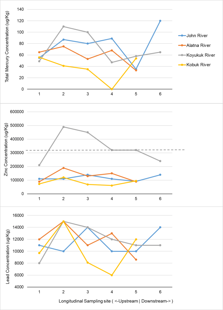 Rivers sampled for this portion of the project are less-impacted by past human development than Dalton Highway sites, but the Koyukuk and John Rivers are influenced by historic and current human activities occurring within the drainages. Levels of metals in sediment were below NOAA screening levels for “probable toxicity to aquatic biota” at all sites, except for the Koyukuk River, where Zinc was elevated at four of six sampling locations (see graph below), and one site on the Kobuk River where arsenic was elevated. The elevated levels may be due to natural geologic processes, or they may be influenced by human impacts, such as the Dalton Highway or mining activities just upstream in the Koyukuk River drainage.