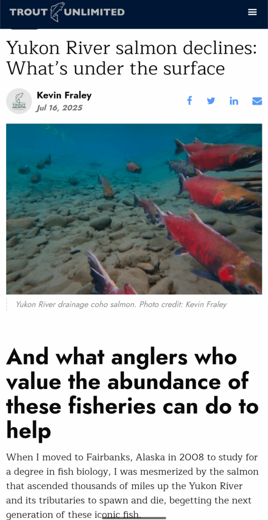 “Yukon River salmon declines: What’s under the surface” July 2025 online article for Trout Unlimited describing the Yukon River drainage salmon conservation crisis